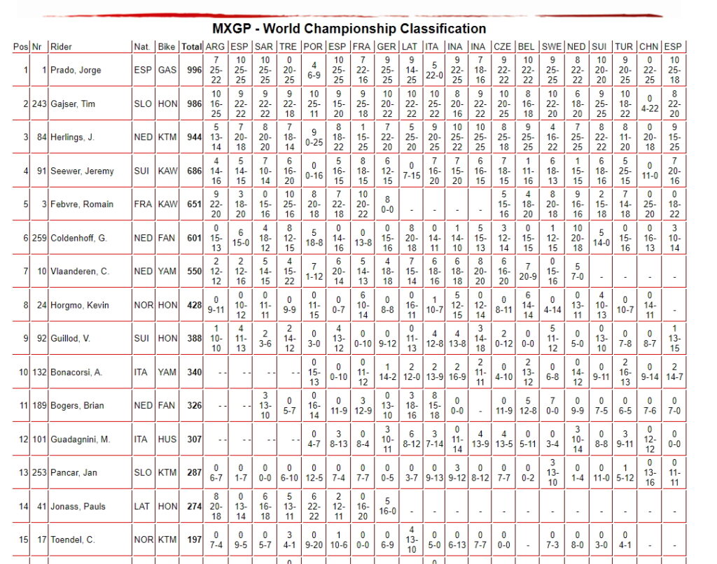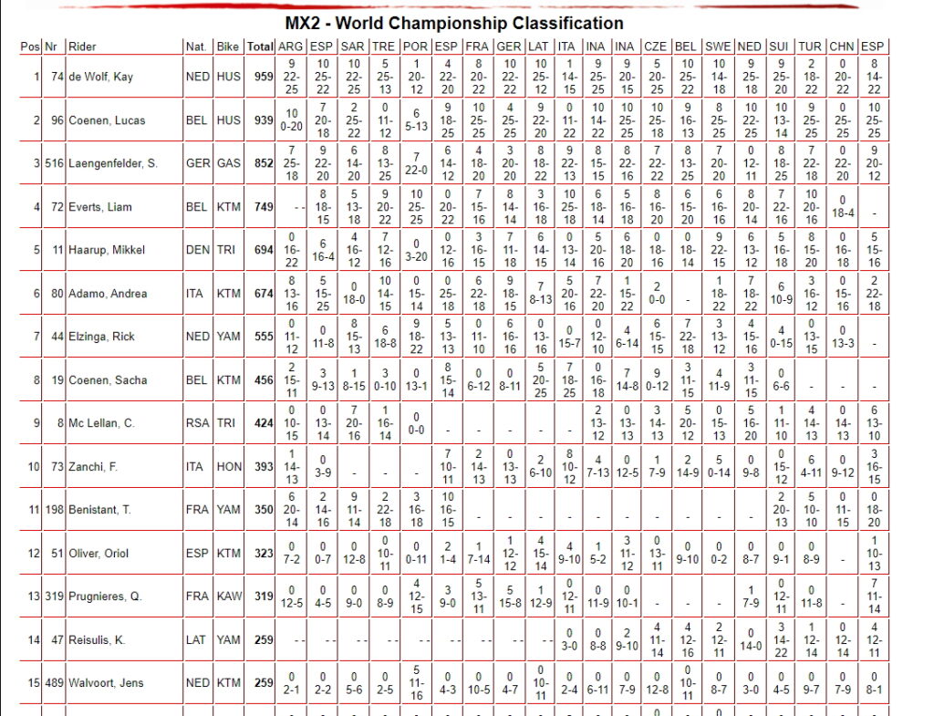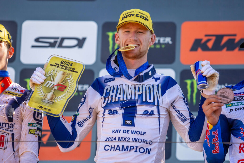 Nella classe minore festeggia il titolo l’olandese della Husqvarna Kay De Wolf, tra l’altro il giorno del suo 20° compleanno. Secondo il nuovo fenomeno Lucas Coenen e terzo il tedesco Simon Laengenfelder. Solo sesto l’iridato uscente Andrea Adamo. Per Husqvarna si tratta del primo titolo sotto la proprietà di KTM. L’ultimo alloro iridato nel motocross era infatti stato conquistato da Chicco Chiodi nel 1999, quando la Husky faceva capo alla MV Agusta. Al contrario quello di Prado potrebbe essere stato l’ultimo di GASGAS, il cui progetto sportivo è congelato a partire dal 2025, in vista di un cambio di asset interno al Gruppo KTM.