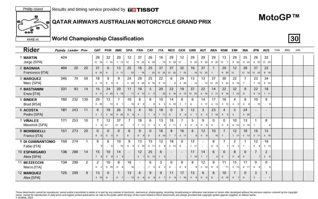 Jorge Martin ha dominato il weekend australiano, vincendo la Sprint Race dopo aver ottenuto la pole position. Il pilota del team Pramac ha condotto la gara dall’inizio alla fine, chiudendo con oltre un secondo e mezzo di vantaggio su Marc Marquez e aumentando il distacco su Pecco Bagnaia in classifica generale a +16 punti. Bagnaia, partito quinto, è risalito al secondo posto, ma è stato poi superato da Marquez e Bastianini, chiudendo quarto.