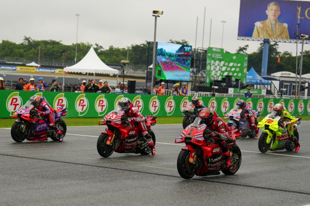 Wet Race quella di ieri al Buriram Circuit, con i piloti schierati in griglia di partenza con gomme rain. Al via, Jorge Martin riesce a portarsi al comando già alla prima curva e, dietro di lui, Pecco Bagnaia cerca di restargli francobollato.