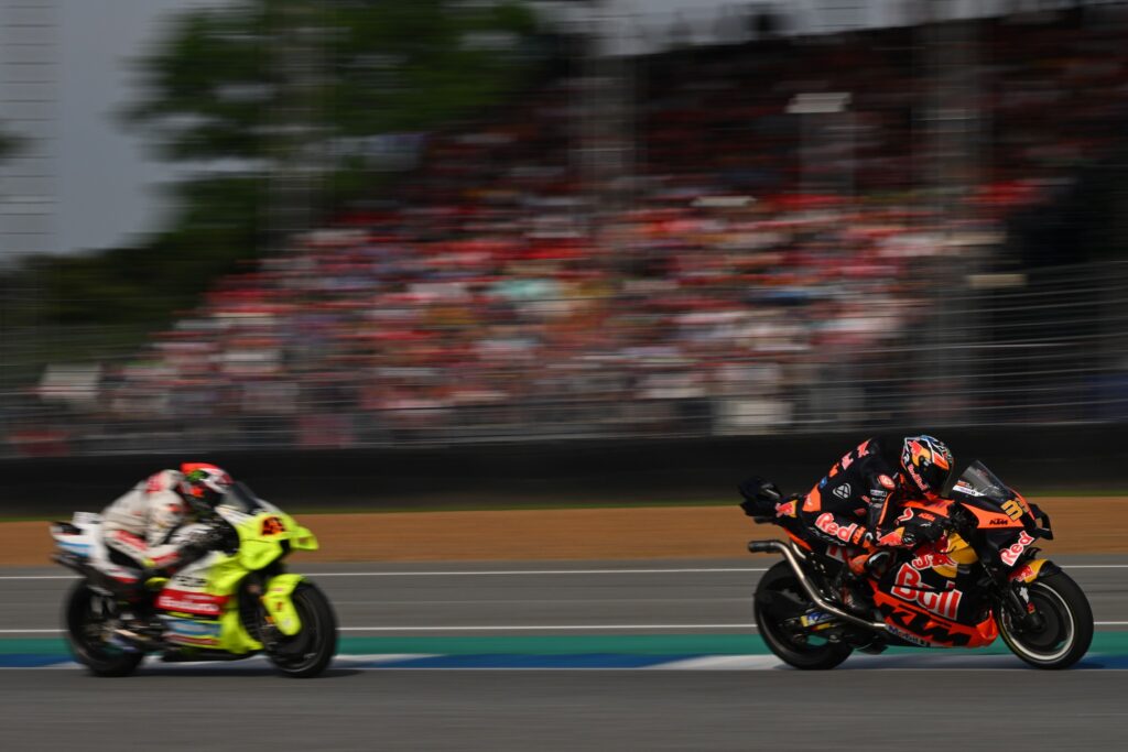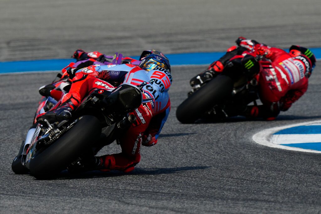 La pressione del piemontese e le condizioni impervie del tracciato hanno portato Martin ad un errore di traiettoria, dove ne hanno approfittato Pecco e Marc Marquez. I due sono poi stati protagonisti di un duello per la prima posizione, ma una scivolata di Marc in ingresso curva ha concesso a Pecco di vincere indisturbato, riducendo a 17 punti il gap nella classifica mondiale con Martin.