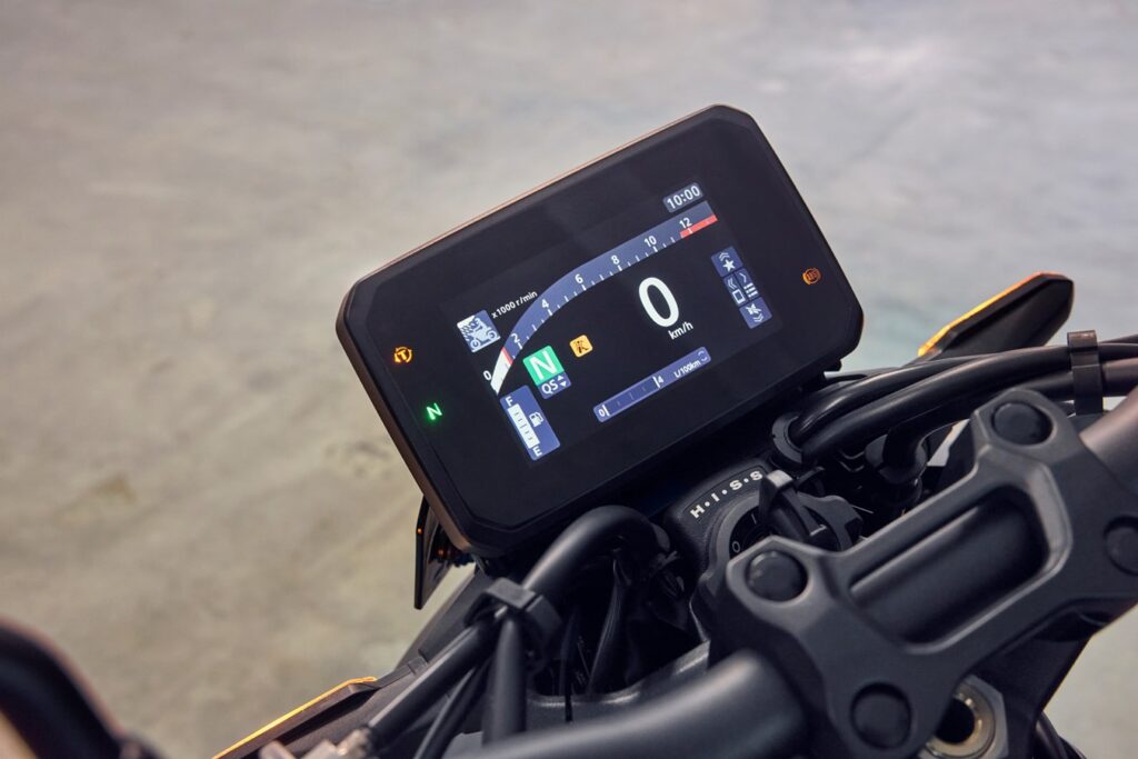 Insieme alla sorella CB1000 Hornet “standard”, Honda presenta anche la nuova CB1000 Hornet SP 2025. Sfrutta gran parte la stessa base tecnica, ma presenta alcuni affinamenti che la rendono più affilata. Ritroviamo, ad esempio, lo stesso motore quattro cilindri in linea derivato dalla CBR1000RR Fireblade 2017-2019, ma con un picco maggiore di coppia e potenza rispetto alla versione standard. Sulla SP sviluppa 157 CV a 11.000 giri/min. e 107 Nm a 9.000 giri/min. L’incremento di +5 CV e +3 Nm rispetto alla versione standard è stato ottenuto grazie all’introduzione della nuova valvola RC (Revolutionary Controlled) posizionata nel silenziatore da 7,1 L. La valvola rimane sempre chiusa in tutte le marce, ma quando si superano i 5.700 giri/min, si spalanca completamente permettendo al motore di ‘respirare’ più liberamente.