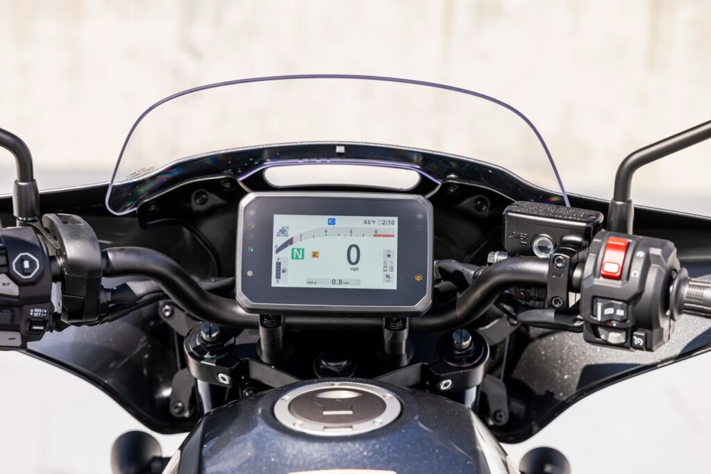 La nuova strumentazione TFT a colori da 5” dispone di connettività per smartphone Honda RoadSync, e la presa di ricarica USB-C è stata riposizionata. Confermato il pacchetto elettronico che prevede il controllo di trazione HSTC (Honda Selectable Torque Control) su 3 livelli, con antiwheelie integrato e Cruise Control.