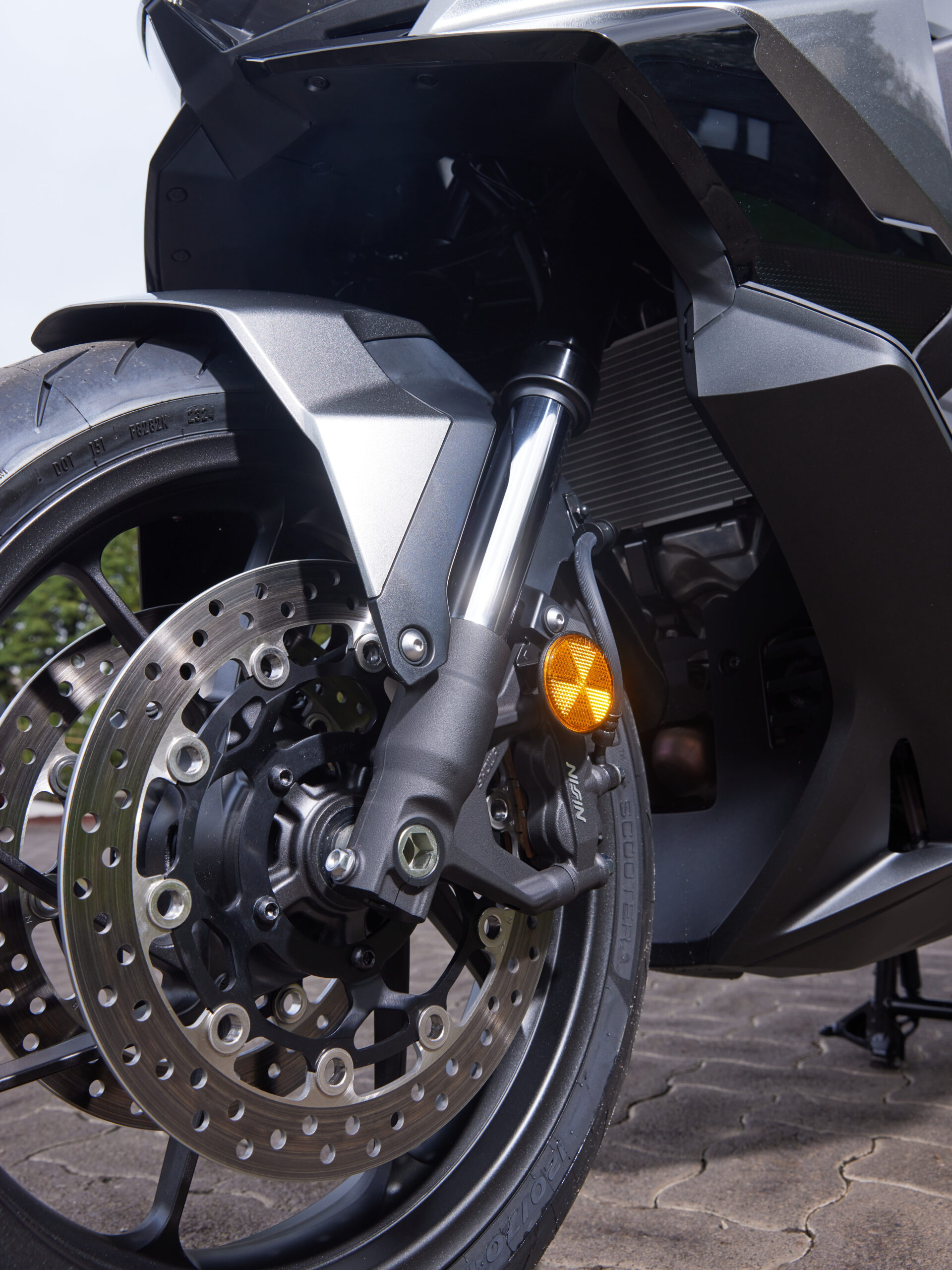 Fuori città, invece, il Forza mostra doti di un ottimo torurer: è stabile sul veloce, non vibra, ripara molto bene dall’aria (lo ribadiamo) e offre ora di serie il cruise control. Tra le curve spicca il suo animo sportivo: è svelto, agile e invita ad ingressi con i freni ancora “in mano”, portando una buona velocità in percorrenza e facendo emergere la solidità e la sincerità di una ciclistica da moto. Convince poi l’impianto frenante, le cui leve (entrambe regolabili nella distanza) sono piuttosto progressive nella prima fase d’attacco, per poi offrire il giusto mordente quando si va a “pinzare” con maggior decisione.